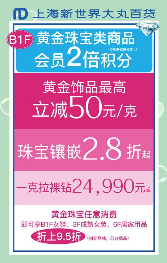珠宝节活动期间商场联合知名珠宝品牌,推出黄金饰品最高每克立减50元,镶嵌珠宝类商品2.8折起,一口价裸钻24990元起,会员2倍积分等一系列大力度的促销活动,在充满爱的节日里给予新世界大丸百货消费者真情回馈。