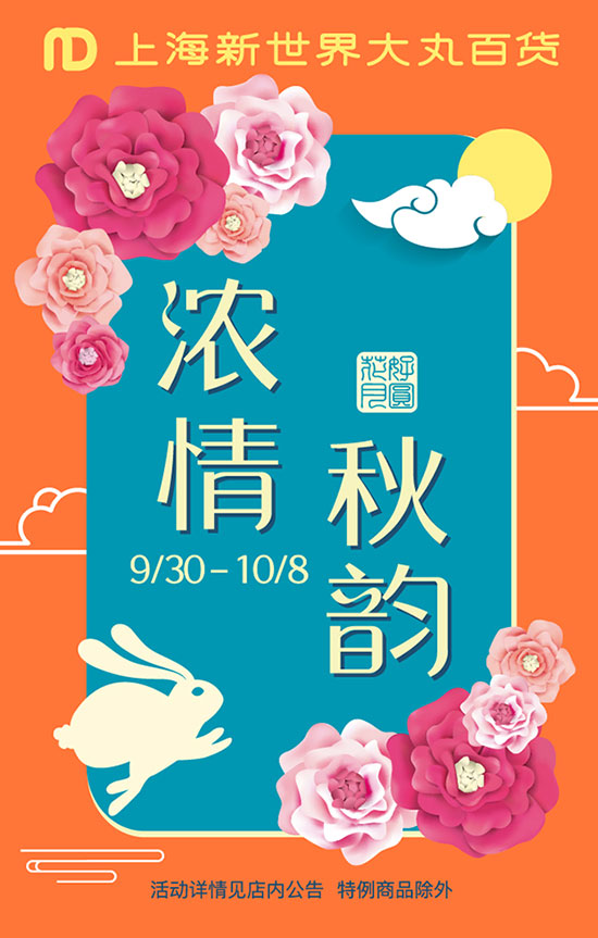 今年的国庆节恰逢中秋佳节,商场抓住南京路外滩迎来大客流的契机,结合上海市购物节、旅游节的双节拉动效应,在9月30日-10月9日期间,上海新世界大丸百货启动“浓情秋韵“国庆特别营销活动,借助节假日的高客流以及双节拉动,通过各式具有节日氛围的活动,为国庆节的销售助力。