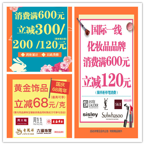 针对此次国庆期间,公司根据客群的性质特别制定了消费满额立减活动,分为600元立减300元/200元/120元三档,全城联动,跨柜累计。通过柜台与柜台、楼层与楼层的联动,不仅将实惠最大程度地回馈消费者,更是促进了相关大类商品的联动。同时,为庆祝祖国68周年生日,B1楼商场黄金饰品最高每克立减68元,镶嵌珠宝类商品3.8折起。