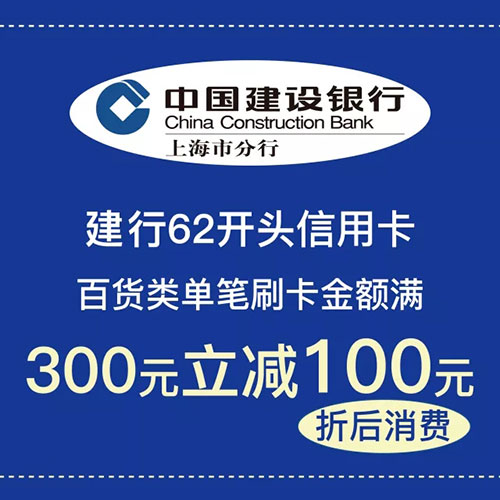 此外商场与中国建设银行开展异业合作,在商场整体活动的基础上,刷62开头的中国建设银行信用卡消费的顾客,还可享折后满300元立减100元的礼遇。