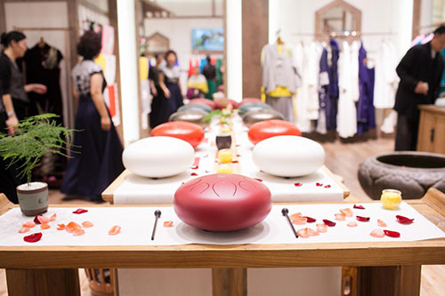 随后,与特邀嘉宾曹欣苗老师共同领略“色空”的魅力。“色空”的创造起源于中国远古编钟。“色空鼓”的音质以空灵、悠远、深沉、醇厚为特色。色空养心,音乐养性,空灵的音,安静的心。
