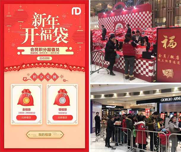 神秘福袋售卖当天,现场大排长龙,人气旺盛。许多老会员一早便前来排队挑选属于自己的新年福袋,感受这份过节的喜庆。会员部还派出了专员对购买福袋的顾客进行注册会员的邀约,当日入会量达上千人,完成会员销售812万元,同比上升38%。