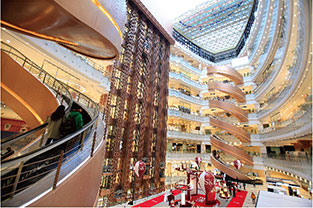 上海新世界大丸百货以其冷峻、内敛、欧式皇族宫殿的外形与外滩百年经 典建筑互为融合,相得益彰,必将共同辉煌,传世百年。走进商场,打造的大尺度空间奢华宽敞,一下子让人感到震撼,人的渺小与天地间的高深,直抒心胸间的舒畅。抬头望中庭顶端的巨大玻璃穹顶中,蓝天白云辉映。其间,超大LED电子屏播放的影像,恍如置身超级影院中。忽而开合的穹顶,清风微拂,神清气爽。两旁亚洲罕见的腾龙造型旋转电梯,缓缓地带着你,走向蓝天白云间。直面中间的观光电梯,让人有一种远观“银河落九天”的意境,起伏间,层层美景令你目不暇接。